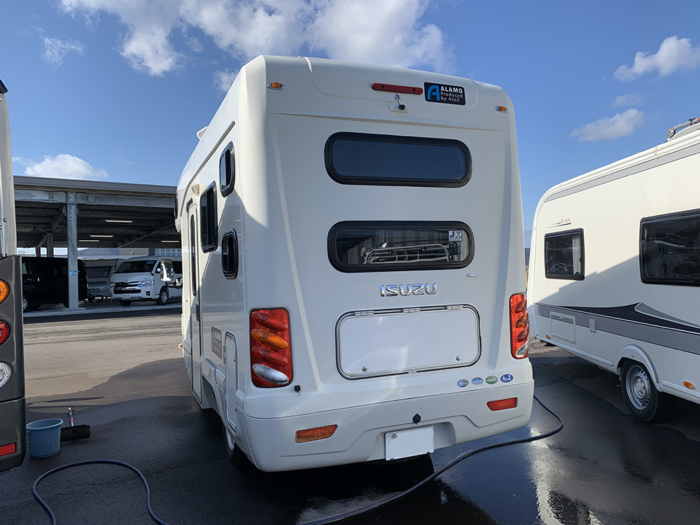 後ろも丸っこくてかわいいです。キャンピングカーにISUZUのロゴも新鮮。