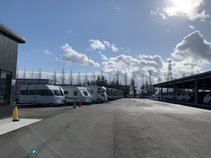 フジカーズジャパン新潟店に到着。バンコン・キャブコン・トレーラー・バスコンと多種多様なキャピングカーが展示されています。ときめきますね。