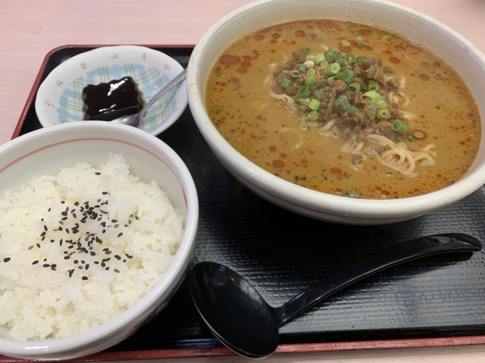鶴岡のはくがさんで晩ご飯。ハイカロリーな担々麺を。こちらの担々麺を頼むとライスがついてきます。ご飯を食べて酒田に戻ります。