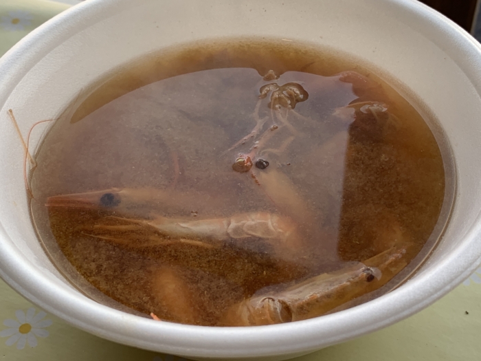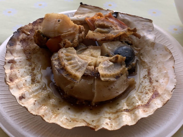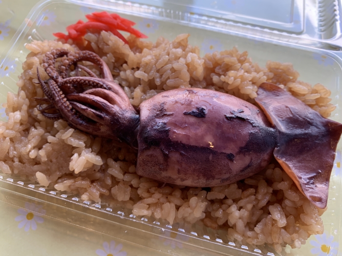 まずは、道の駅あつみで朝食休憩。ほたて焼き、海老汁、岩のりのおにぎり、イカめしを購入。