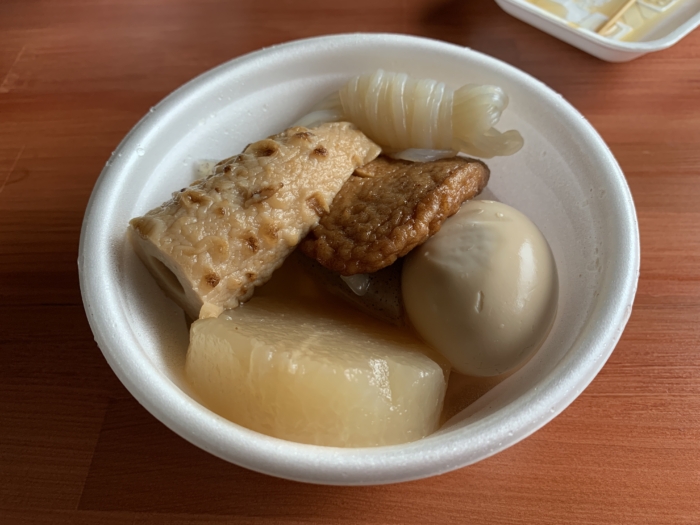 無事、スタンプ押印。小腹が空いたので、おでんと玉こんにゃくを買って車内で食べました。