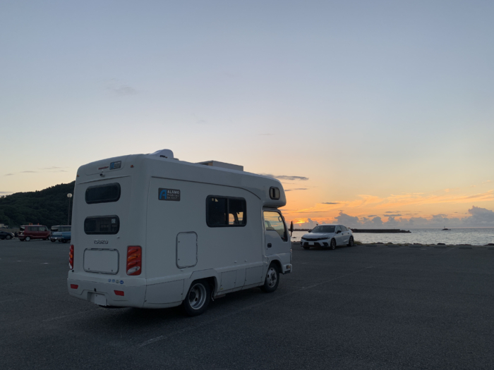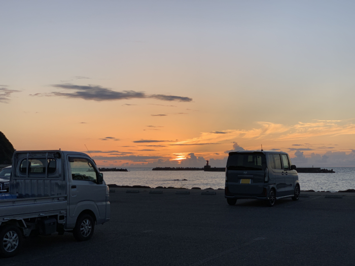 福島県→新潟県に入り国道7号線を北上。庄内に入って、「このまま帰るのがもったいないから夕日をみよう」ということで、由良の駐車場にやってきました。