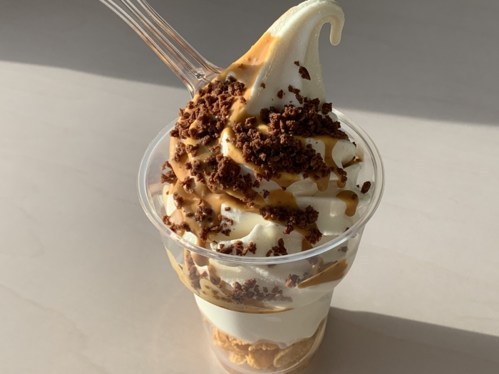 蕎麦チョコサンデー。蕎麦風味のクランチチョコがごろごろ入っていて食べ応えもあります。