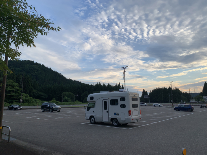 いい場所がとれました。他にもキャブコンやバンコン、ミニバンでの車中泊が複数台いました。仕事をしたりネットを見たりして過ごしました。
