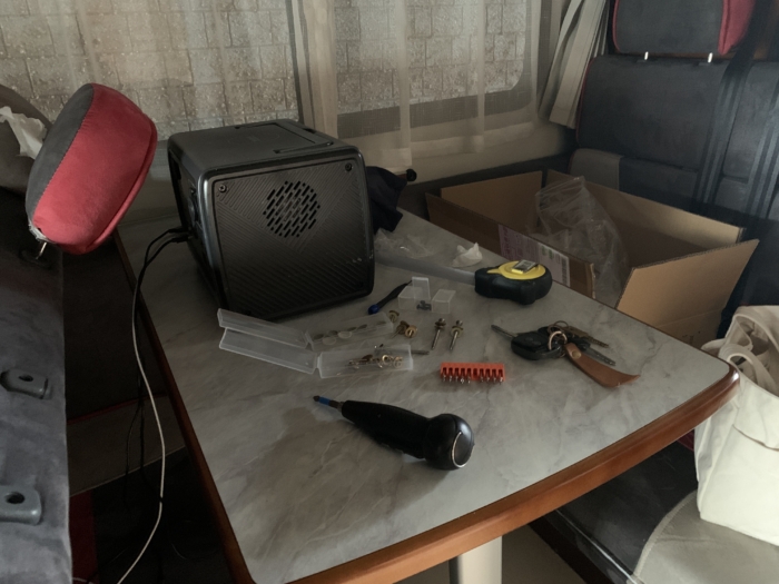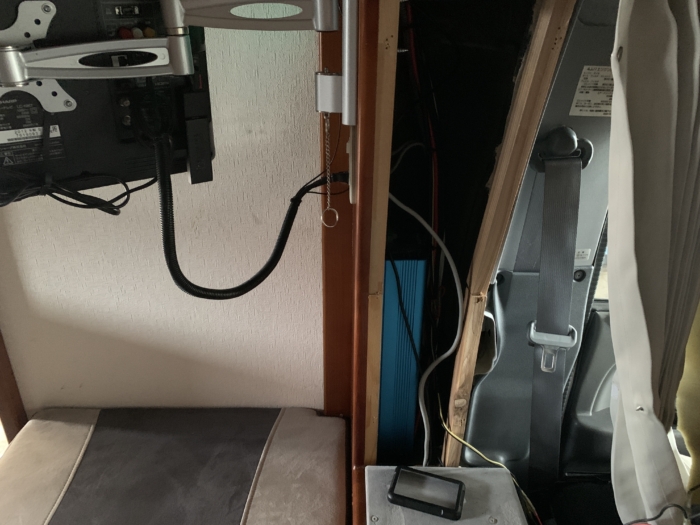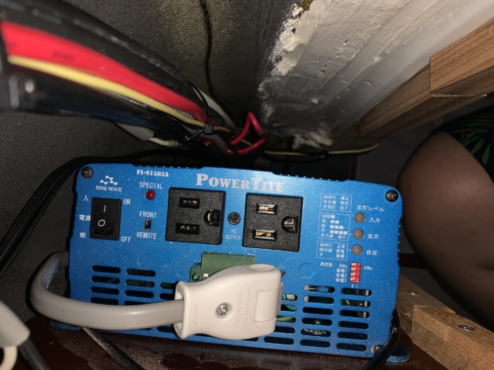 助手席とダイネット側の間の隙間にPowerTite社のインバーターが設置されています。取り外すのにかなり苦労しました。